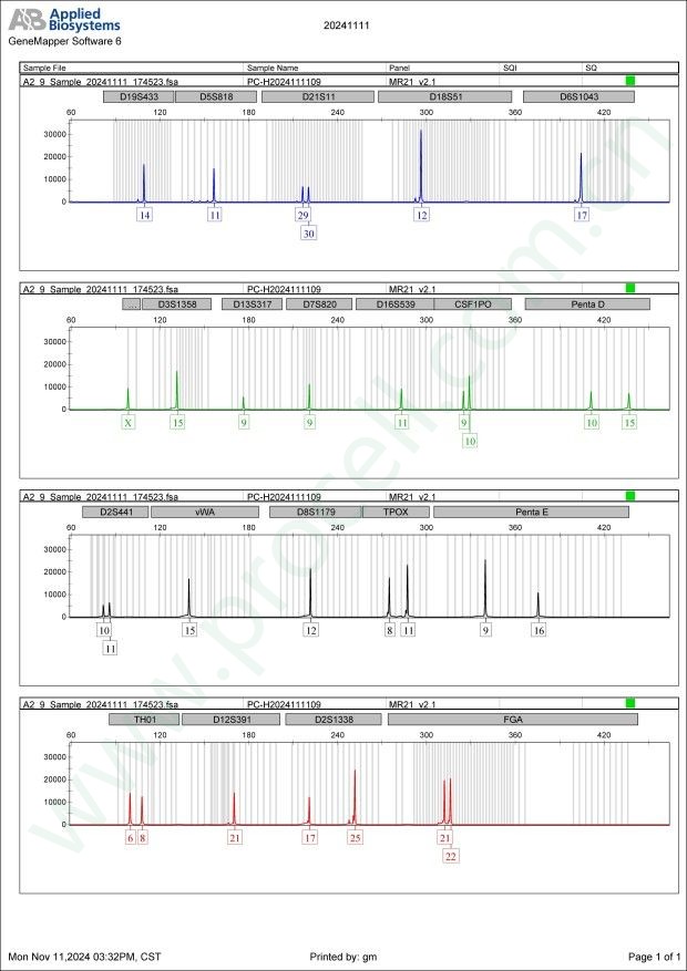 Amelogenin X CSF1PO 9,10 D2S1338 17,25 D3S1358 15 D5S818 11 D7S820 9 D8S1179 12 D13S317 9 D16S539 11 D18S51 12 D19S433 14 D21S11 29,30 FGA 21,22 PentaD 10,15 PentaE 9,16 TH01 6,8 TPOX 8,11 vWA 15 D6S1043 17 D12S391 21 D2S441 10,11 -