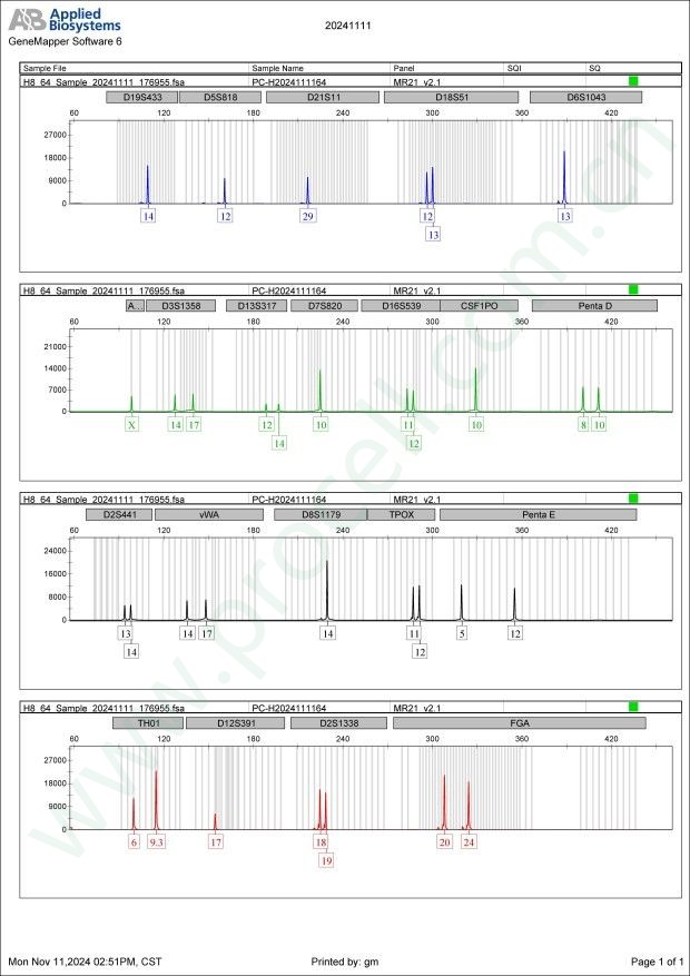 Amelogenin X CSF1PO 10 D2S1338 18,19 D3S1358 14,17 D5S818 12 D7S820 10 D8S1179 14 D13S317 12,14 D16S539 11,12 D18S51 12,13 D19S433 14 D21S11 29 FGA 20,24 PentaD 8,10 PentaE 5,12 TH01 6,9.3 TPOX 11,12 vWA 14,17 D6S1043 13 D12S391 17 D2S441 13,14 -