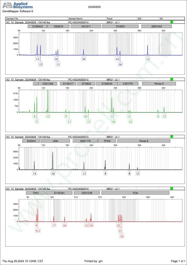 Amelogenin X,Y CSF1PO 11,12 D2S1338 21,24 D3S1358 15 D5S818 10,11 D7S820 10,12 D8S1179 12 D13S317 9,11 D16S539 13,14 D18S51 14,16 D19S433 13,15 D21S11 30 FGA 22,23,24 PentaD 9,12 PentaE 8,12 TH01 9,9.3 TPOX 8 vWA 16 D6S1043 11 D12S391 17,24 D2S441 14 -