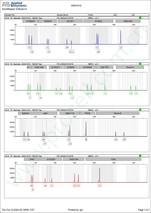 Amelogenin X, Y CSF1PO 11 D2S1338 22,25 D3S1358 14,16 D5S818 11,12 D7S820 10,12 D8S1179 12,13 D13S317 11,14 D16S539 10,13 D18S51 15,16 D19S433 12,14 D21S11 29,32.2 FGA 22 PentaD 10,13 PentaE 14,19 TH01 8,9 TPOX 8 vWA 16,17 D6S1043 11 D12S391 16,21 D2S441 11,14 -