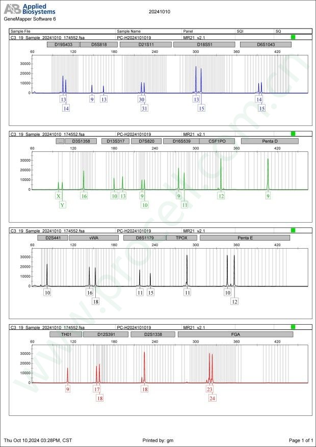 Amelogenin X, Y CSF1PO 12 D2S1338 18 D3S1358 16 D5S818 9,13 D7S820 9,10 D8S1179 11,15 D13S317 10,13 D16S539 9,11 D18S51 13,15 D19S433 13,14 D21S11 30,31 FGA 23,24 PentaD 9 PentaE 10,12 TH01 9 TPOX 11 vWA 16,18 D6S1043 14,15 D12S391 17,18 D2S441 10 -