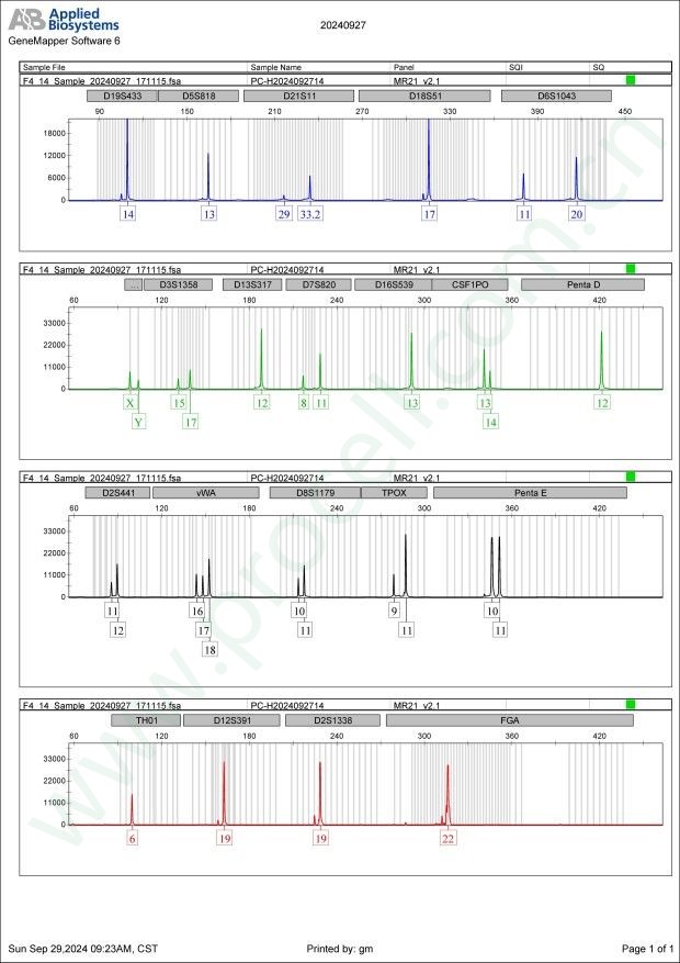 Amelogenin X, Y CSF1PO 13,14 D2S1338 19 D3S1358 15,17 D5S818 13 D7S820 8,11 D8S1179 10,11 D13S317 12 D16S539 13 D18S51 17 D19S433 14 D21S11 29,33.2 FGA 22 PentaD 12 PentaE 10,11 TH01 6 TPOX 9,11 vWA 16,17,18 D6S1043 11,20 D12S391 19 D2S441 11,12 -