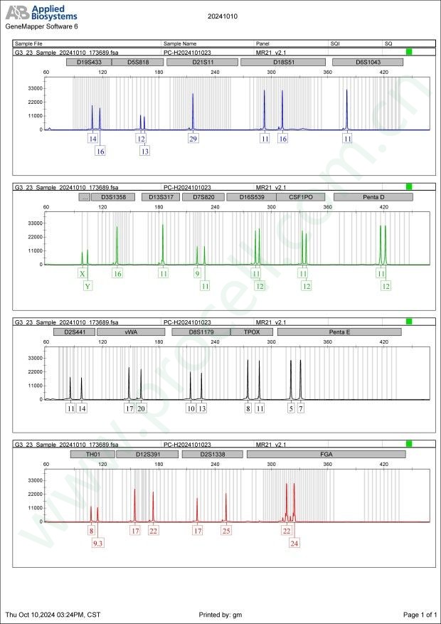 Amelogenin X, Y CSF1PO 11,12 D2S1338 17,25 D3S1358 16 D5S818 12,13 D7S820 9,11 D8S1179 10,13 D13S317 11 D16S539 11,12 D18S51 11,16 D19S433 14,16 D21S11 29 FGA 22,24 PentaD 11,12 PentaE 5,7 TH01 8,9.3 TPOX 8,11 vWA 17,20 D6S1043 11 D12S391 17,22 D2S441 11,14 -
