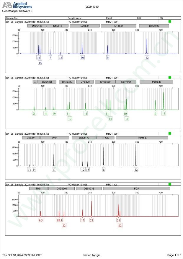 Amelogenin X CSF1PO 10,11 D2S1338 17,23 D3S1358 14,19 D5S818 7,13 D7S820 11 D8S1179 12,15 D13S317 11,12 D16S539 11,13 D18S51 9 D19S433 14,15 D21S11 30 FGA 21,22 PentaD 9,13 PentaE 12 TH01 9.3 TPOX 8 vWA 17 D6S1043 12 D12S391 18.3,22 D2S441 11,14 -