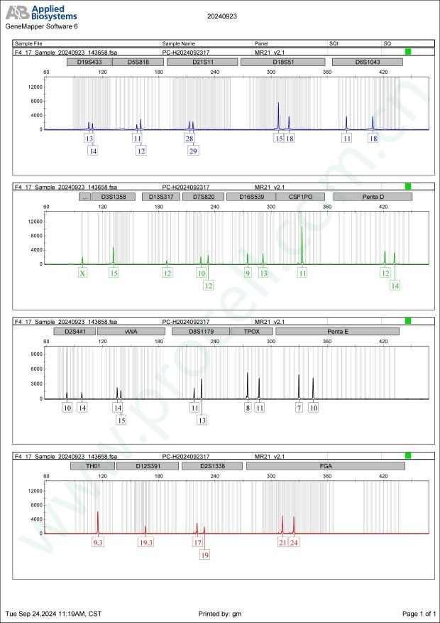 Amelogenin X CSF1PO 11 D2S1338 17,19 D3S1358 15 D5S818 11,12 D7S820 10,12 D8S1179 11,13 D13S317 12 D16S539 9,13 D18S51 15,18 D19S433 13,14 D21S11 28,29 FGA 21,24 PentaD 12,14 PentaE 7,10 TH01 9.3 TPOX 8,11 vWA 14,15 D6S1043 11,18 D12S391 19.3 D2S441 10,14 -