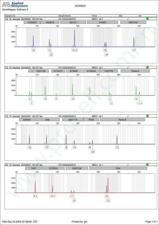 Amelogenin X, Y CSF1PO 11,12 D2S1338 17,19 D3S1358 18 D5S818 11,12 D7S820 10 D8S1179 8,14 D13S317 9 D16S539 9 D18S51 18,19 D19S433 14 D21S11 32.2 FGA 24,25 PentaD 10,11.4 PentaE 12 TH01 9.3 TPOX 8,10 vWA 17 D6S1043 17 D12S391 19.3 D2S441 14 -