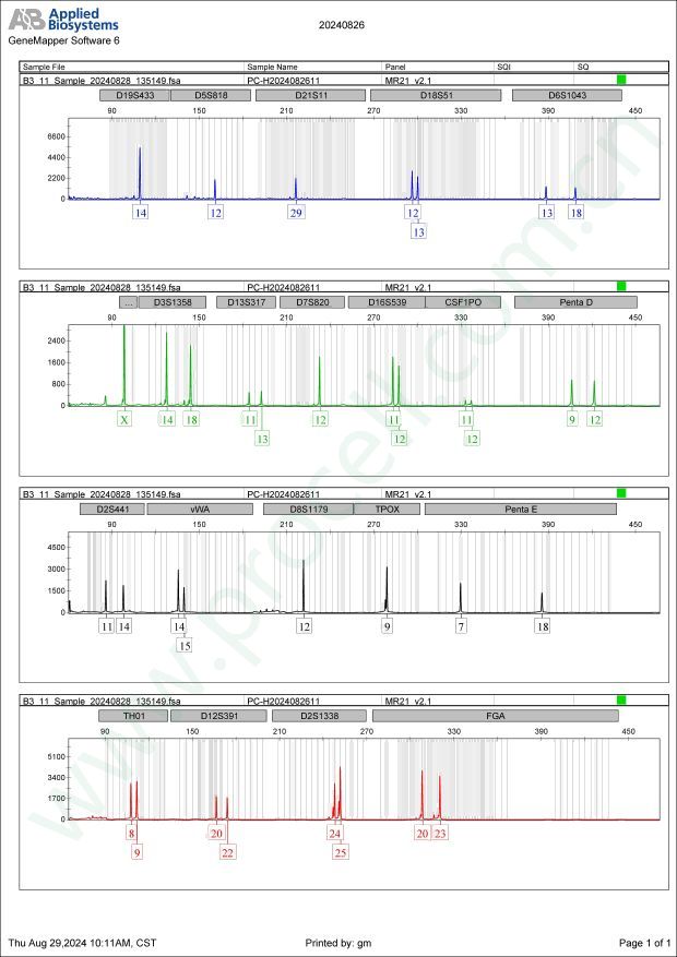 Amelogenin X CSF1PO 11,12 D2S1338 24,25 D3S1358 14,18 D5S818 12 D7S820 12 D8S1179 12 D13S317 11,13 D16S539 11,12 D18S51 12,13 D19S433 14 D21S11 29 FGA 20,23 PentaD 9,12 PentaE 7,18 TH01 8,9 TPOX 9 vWA 14,15 D6S1043 13,18 D12S391 20,22 D2S441 11,14 -